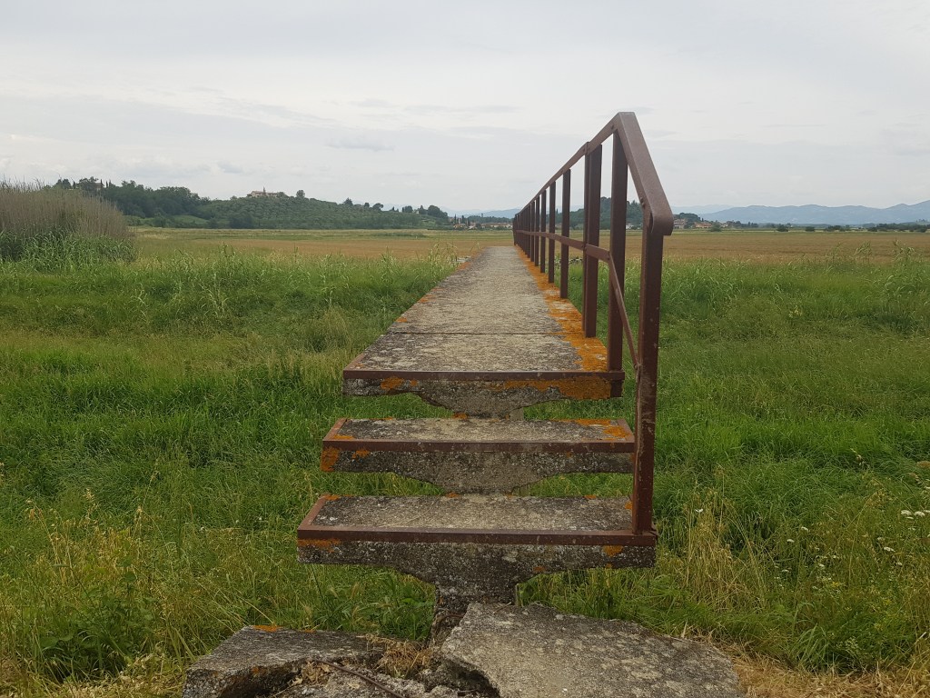 Attraversiamo fiumi e paludi, un tempo ostacoli rischiosi per i pellegrini medievali, ma per noi moderni viandanti dovrebbe essere un’esperienza sicura. In realtà, alcuni tratti non sono poi così sicuri, guardate questo ponte, ha solo un corrimano arrugginito, pericolante con una passerella molto stretta, come dimostra questa foto: