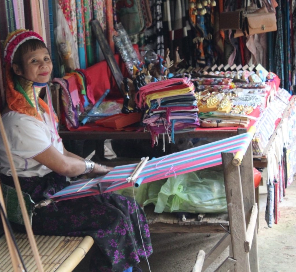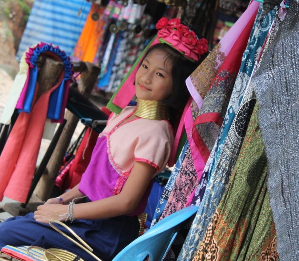 Di fronte al camp degli elefanti, abbiamo visitato il villaggio delle donne dal collo lungo, note anche come Kayan. Queste donne indossano anelli di ottone attorno al collo, che iniziano a mettere fin da bambine. Continuano ad inserire anelli al collo come simbolo di bellezza. Gli anelli, con il tempo, spingono le clavicole verso il basso, portando ad avere un collo più allungato. I mariti lavorano con gli elefanti, mentre le donne creano artigianato e gestiscono bancarelle. Vivono in armonia con la natura, in un villaggio immerso nella giungla. Alcuni villaggi non hanno neanche energia elettrica e usano fuoco e candele.